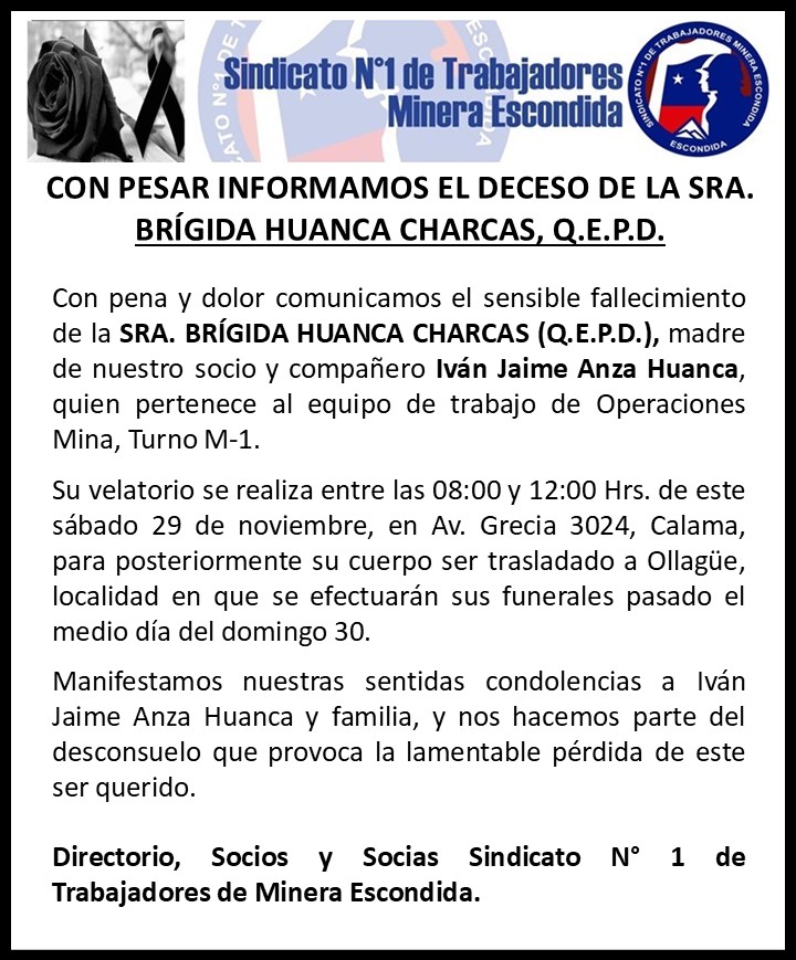 Noticias Obituario COMUNICAMOS CON AFLICCIÓN EL DECESO DE LA SRA. BRÍGIDA HUANCA CHARCAS, Q.E.P.D. PorHector Araya 29 de noviembre de 2025