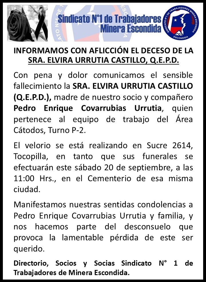 COMUNICAMOS CON PESAR EL DECESO DE LA SRA. ELVIRA URRUTIA CASTILLO, Q.E.P.D.