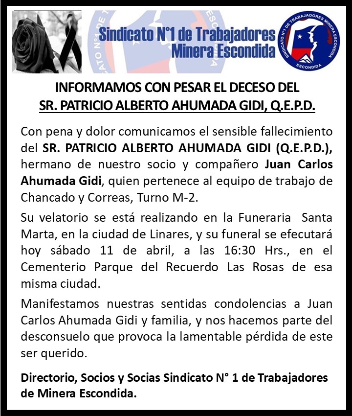 Noticias Obituario CON AFLICCIÓN COMUNICAMOS EL DECESO DEL SR. PATRICIO ALBERTO AHUMADA GIDI, Q.E.P.D. PorHector Araya 11 de abril de 2026