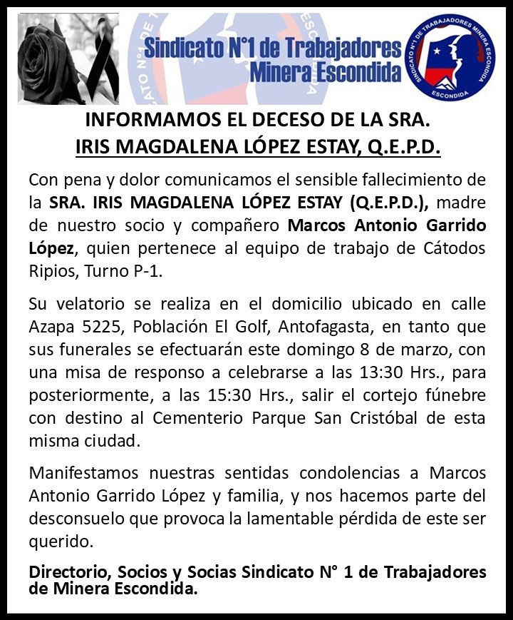 Noticias Obituario CON AFLICCIÓN COMUNICAMOS EL FALLECIMIENTO DE LA SRA. IRIS MAGDALENA LÓPEZ ESTAY, Q.E.P.D. PorHector Araya 7 de marzo de 20267 de marzo de 2026