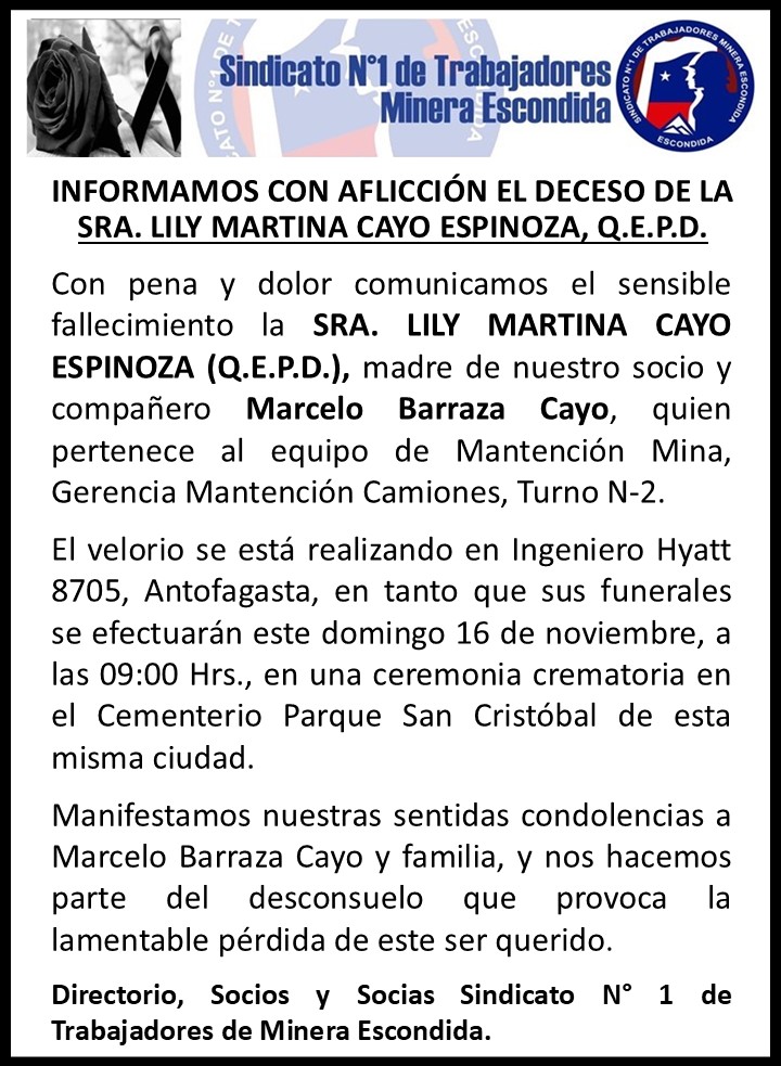 Noticias Obituario CON PESAR COMUNICAMOS EL DECESO DE LA SRA. LILY MARTINA CAYO ESPINOZA, Q.E.P.D. PorHector Araya 15 de noviembre de 2025
