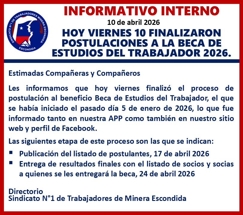 Noticias Noticias destacadas CONCLUYERON LS POSTULACIONES A LA BECA DE ESTUDIOS DEL TRABAJADOR 2026. PorHector Araya 11 de abril de 2026