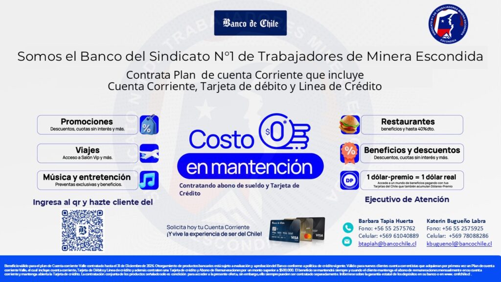 Banco de Chile dispone para las socias y socios de nuestro sindicato los beneficios que se mencionan a continuación.