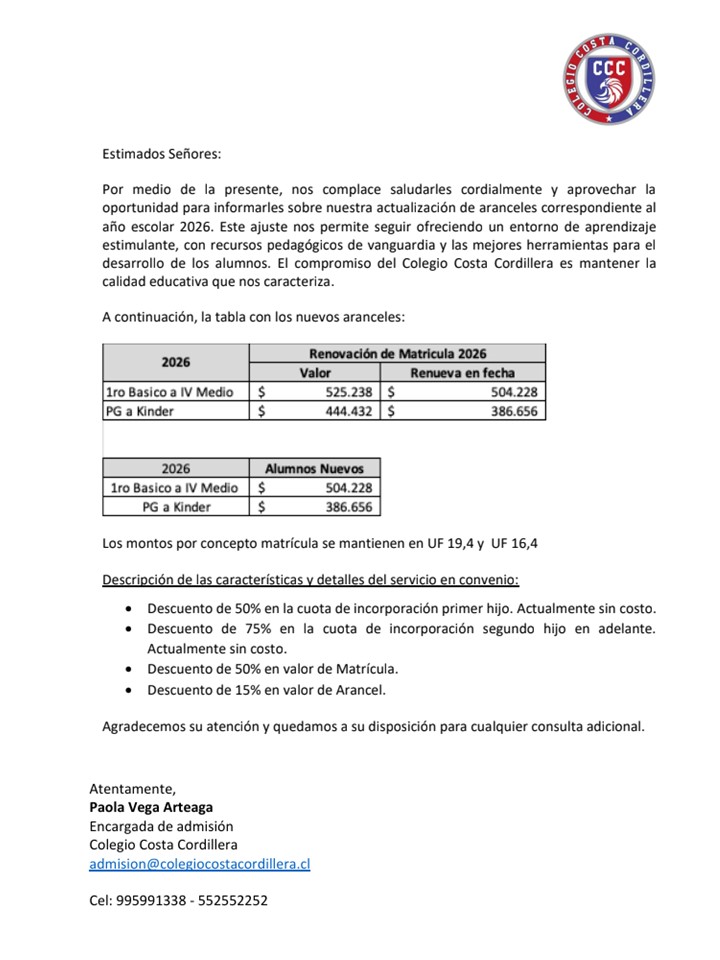 - Correo electrónico admision@colegiocostacordillera.cl