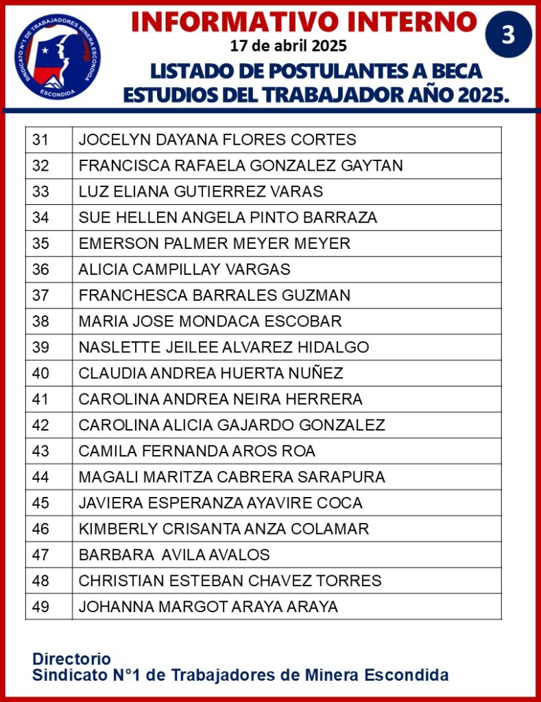 Noticias Noticias destacadas DIRECTORIO DA A CONOCER LISTADO DE POSTULANTES A BECA DE ESTUDIOS DEL TRABAJADOR 2025 PorHector Araya 18 de abril de 2025