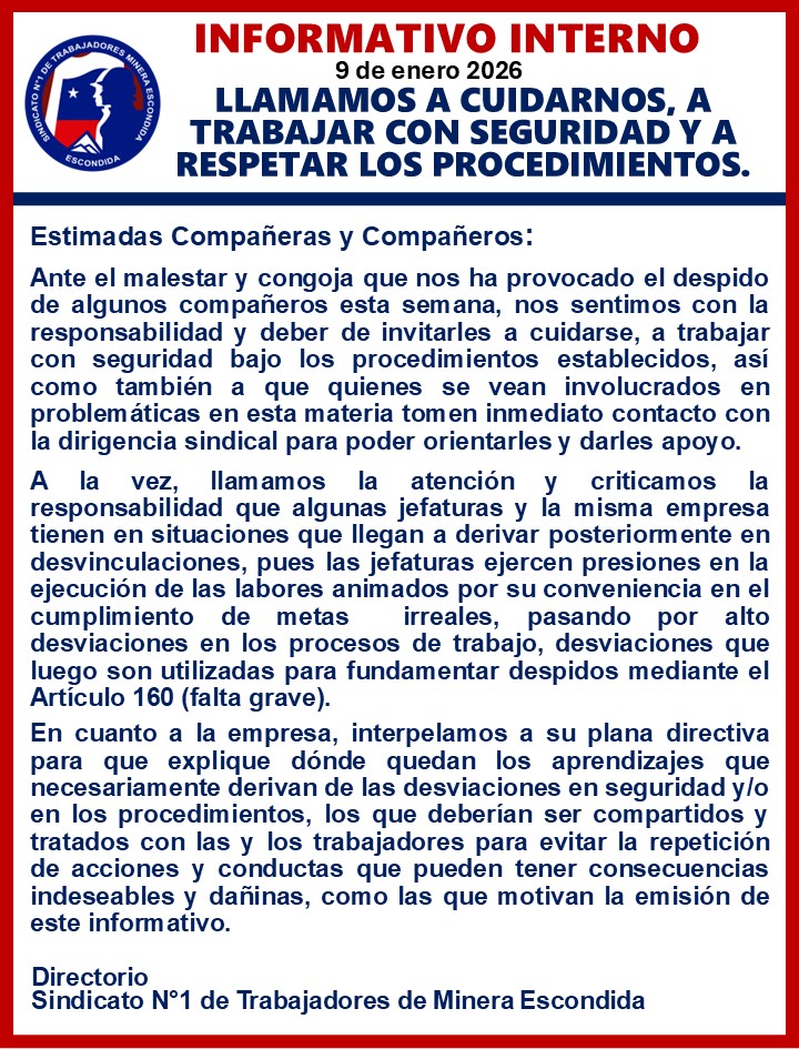 Copyright © 2024, Todos los derechos reservados. Sindicato Nº1 de Trabajadores Minera Escondida.