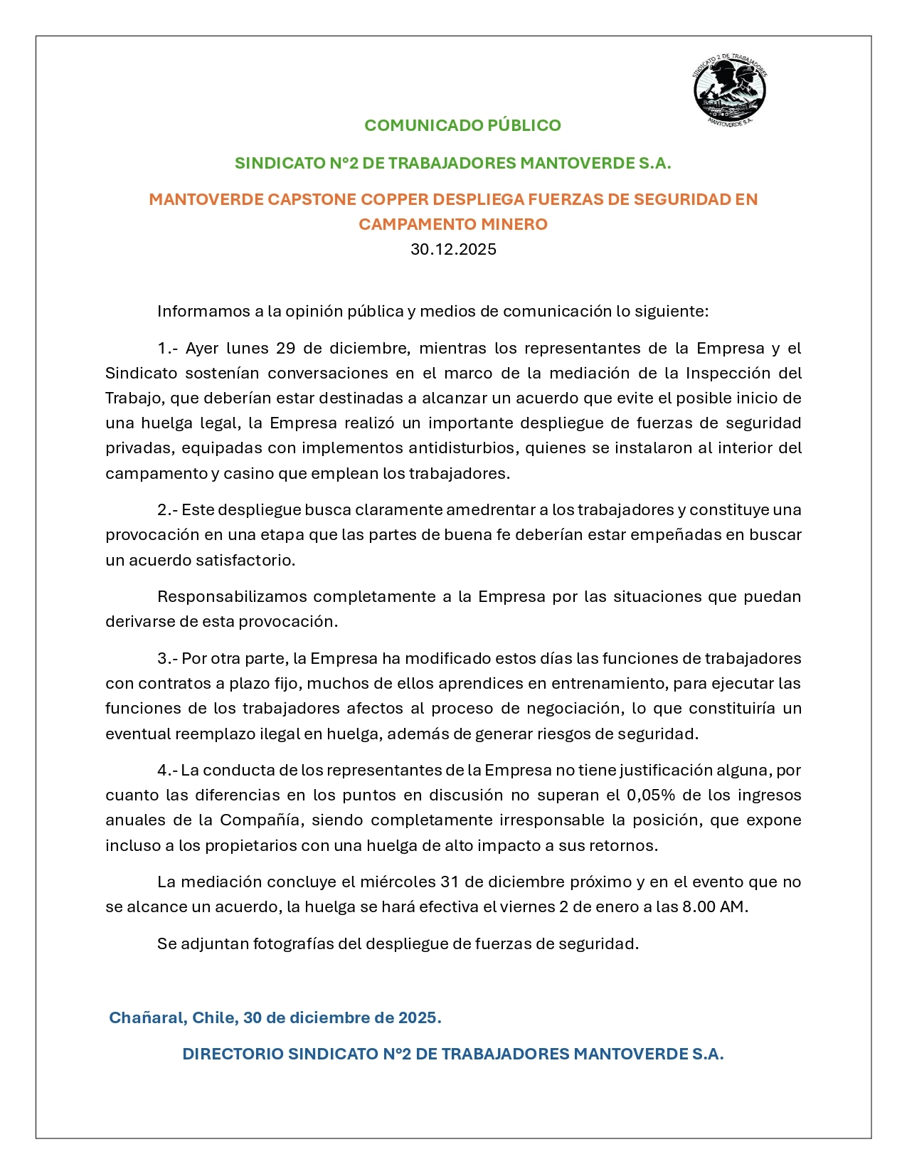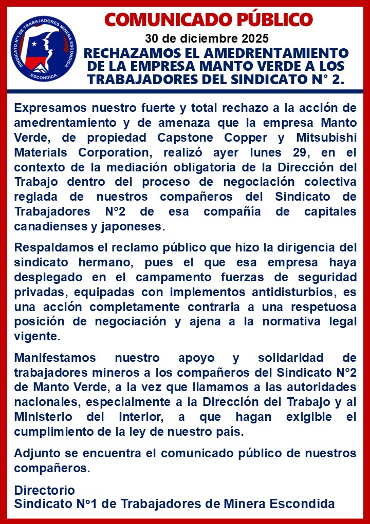 Noticias Noticias destacadas EXPRESAMOS NUESTRA SOLIDARIDAD CON EL SINDICATO 2 DE TRABAJADORES DE MANTO VERDE, ANTE AMEDRENTAMIENTO DE LA EMPRESA PorHector Araya 31 de diciembre de 2025