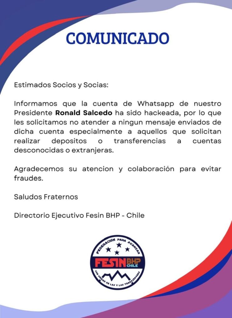 Noticias Noticias destacadas HACKEARON WHATSAPP DE PRESIDENTE DE DIRECTORIO EJECUTIVO DE LA FESIN-BHP PorHector Araya 29 de diciembre de 2025