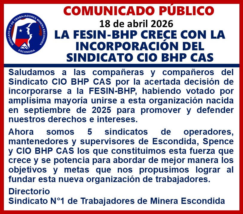 LA FESIN-BHP CRECE CON LA INCORPORACIÓN DEL SINDICATO CIO BHP CAS