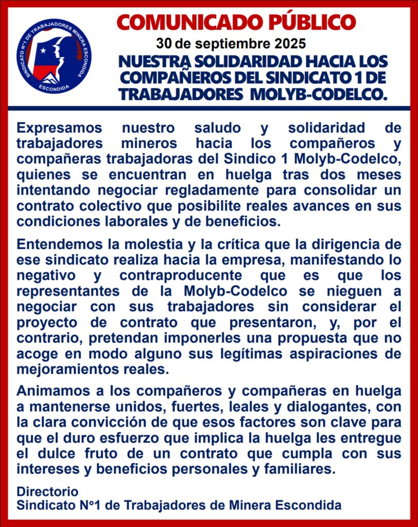 El informador Noticias NUESTRA SOLIDARIDAD CON LOS COMPAÑEROS EN HUELGA DEL SINDICATO 1 MOLYB-CODELCO PorHector Araya 30 de septiembre de 2025