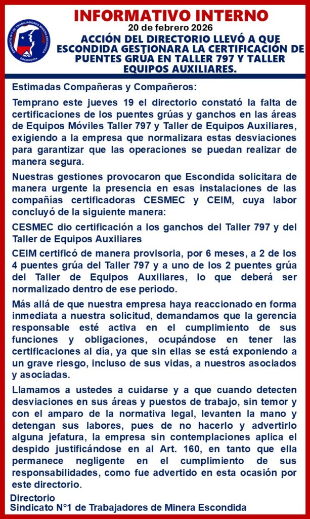 Noticias Noticias destacadas RÁPIDA GESTIÓN DEL DIRECTORIO ANTE FALTA DE CERTIFICACIONES EN TALLERES DE EQUIPOS MÓVILES Y EQUIPOS AUXILIARES PorHector Araya 20 de febrero de 2026 Equipo de trabajo de CESMEC en labores de certificación de los ganchos de los puentes grúa.
