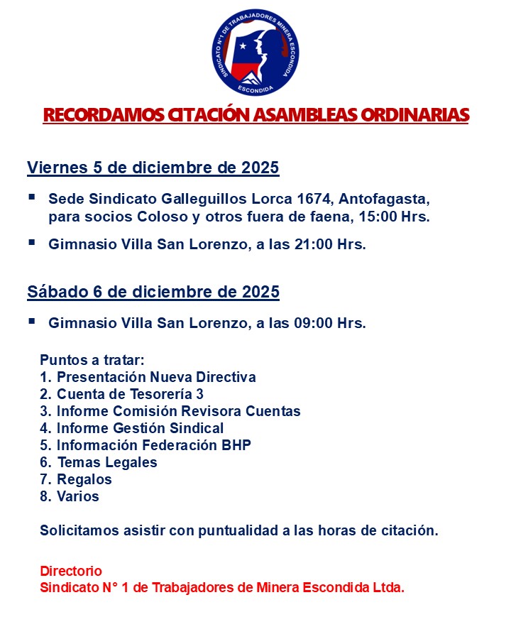 Copyright © 2024, Todos los derechos reservados. Sindicato Nº1 de Trabajadores Minera Escondida.