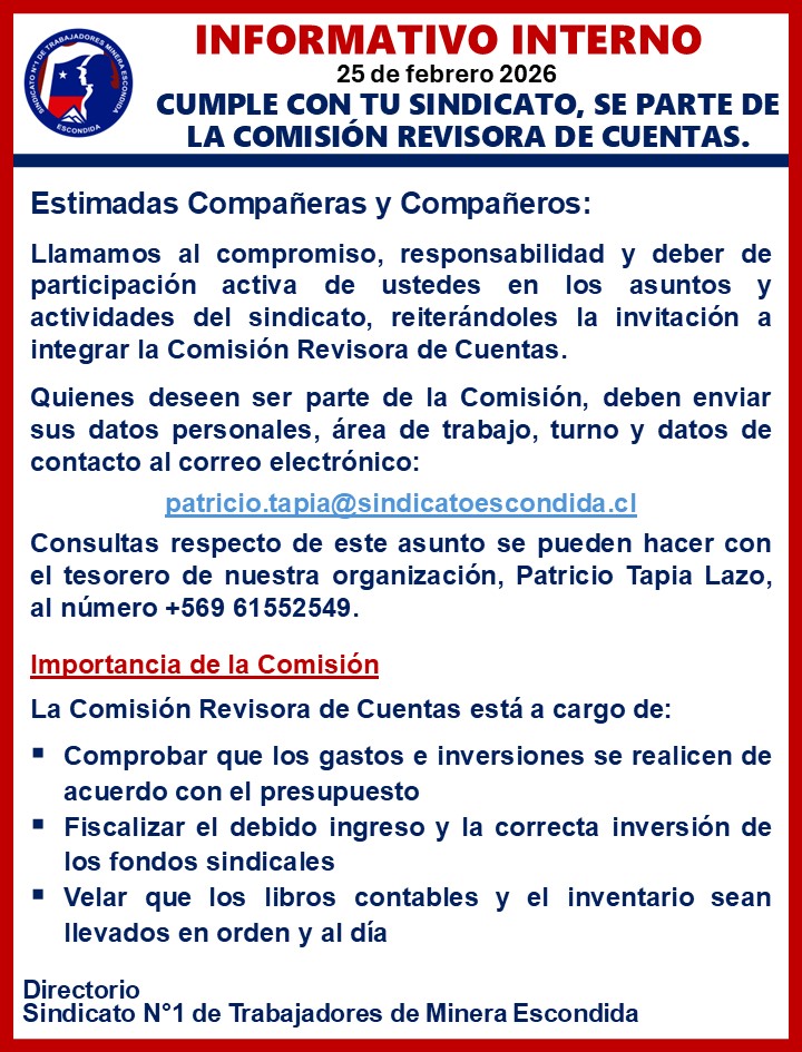 Noticias Noticias destacadas SE PARTE DE LA COMISIÓN REVISORA DE CUENTAS DE NUESTRO SINDICATO PorHector Araya 25 de febrero de 2026